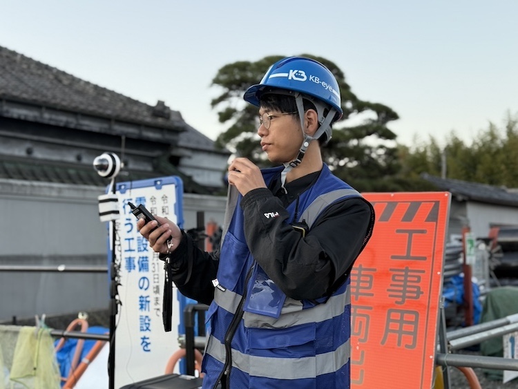 KB-eyeは、片側交互通行、工事区間の枝道脇道監視など、屋外警備に特化したAI交通誘導システムです。